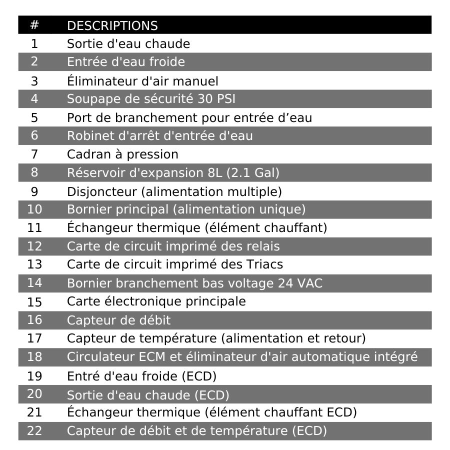 - Fonction combinée : Chauffage hydronique + eau chaude domestique instantanée