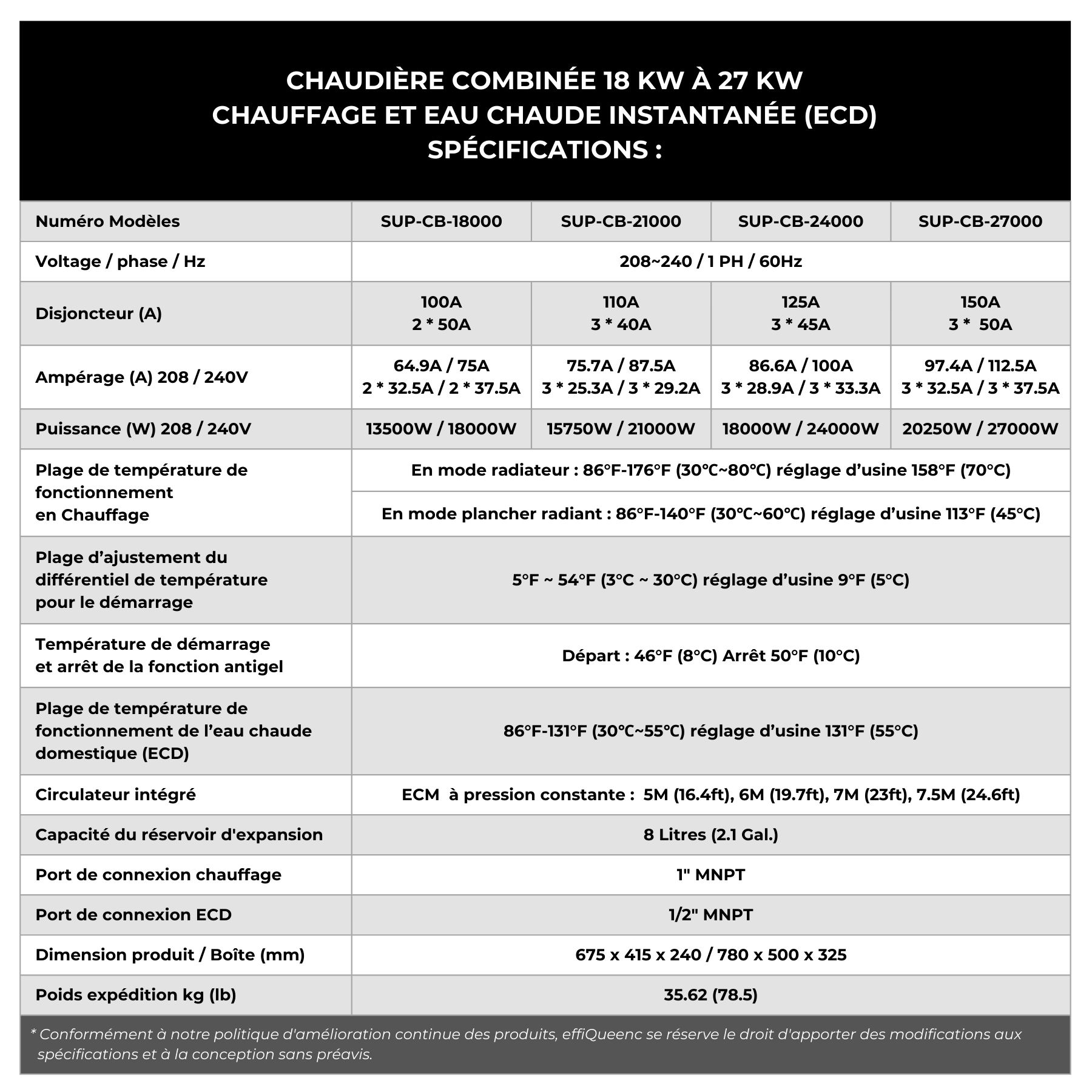 La SUPRA Combi, développée par effiQueenc, intègre à la fois le chauffage hydronique et la production d’eau chaude domestique (ECD) dans une seule unité compacte et 100 % modulante. Offerte en puissances de 7 à 27 kW, elle ajuste automatiquement sa puissance selon les besoins réels, assurant ainsi une efficacité énergétique optimale.